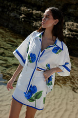 The Aston Studio Ula Mini Skirt combines effortless style with comfort. Designed to sit comfortably at the waist, it features a flattering A-line silhouette adorned with the vibrant Foam/Celeste print and bold blue floral motifs. The soft fabric ensure all-day ease, making this mini skirt the perfect companion for sunny days and breezy evenings.