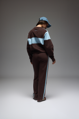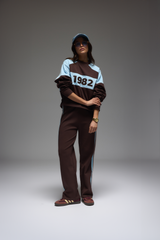 Elevate your everyday wardrobe with the Araminta James 1982 Contrast Knit Sweater in Espresso. Crafted from soft, high-quality cotton, this statement knit features pale blue contrast panels and the exclusive 1982 felt applique at the chest, a nod to sporty-cool nostalgia.