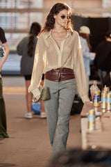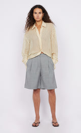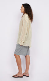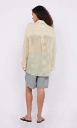 Elevate your style with the BEC + BRIDGE Anise Shirt in Butter and Plum, featuring a delicate striped pattern on a fine semi-sheer fabric. This lightweight, oversized shirt has a relaxed silhouette with long sleeves, a button-up front, and concealed fastenings for a clean, polished look. Designed for versatility, it’s perfect for tucking into jeans or tailored pants for a chic daytime ensemble, or layering as a stylish cover-up on your next getaway.