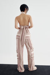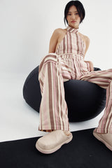 The Audrey halter top is a new style from the Odyssey collection. A cropped, backless halter shape featuring a collar band and tie detail at the center back. The Audrey halter top is made from a custom handloomed stripe fabric.