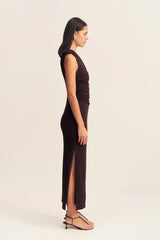 Thoughtful gathering at the shoulder and waist creates a flattering silhouette, while the side split adds movement and subtle allure. The stretch cotton jacquard fabric ensures comfort and style in one, making it perfect for events, evening wear, or elevated everyday looks.