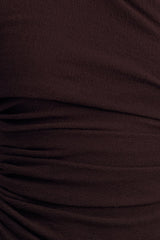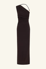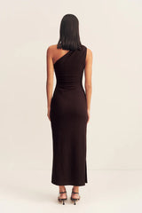 Elevate your wardrobe with the Asymmetrical Gathered Midi Dress in Espresso, crafted from soft, 100% Good Earth Cotton jacquard for a rich, textured feel. This midi dress features a one-shoulder neckline with a tie detail accented by marble-look beads, bringing an elegant, earthy charm to your look.
