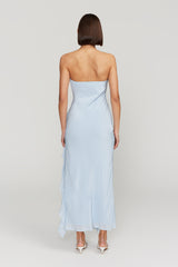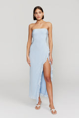 Ethereal elegance meets effortless style with the Calista Maxi Dress in Sky by Ownley. Crafted from lightweight rayon, this strapless maxi dress features a soft, flowing silhouette with an asymmetrical hemline and delicate ruffle detail, creating the perfect blend of feminine and modern. Designed for comfort and sophistication, it’s fully lined with a subtle stretch for the perfect fit. The invisible side zipper ensures a seamless finish, while the sky-blue hue adds a dreamy, romantic touch.