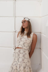 Designed in the same intricate crochet-style lace as her matching skirt, she’s feminine, refined, and effortlessly cool. The kind of piece that turns a simple summer moment into a memory.
