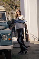 A standout custom printed front panel adds a unique design edge, while the short sleeves and breathable fabric make it perfect for all-day wear. Style it with the Cloe Knit Pant in Espresso for an effortless, coordinated outfit that blends casual comfort with cool, contemporary flair.