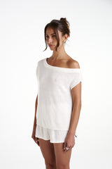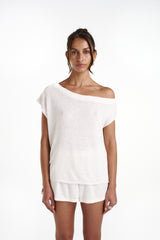 Designed with an asymmetrical off-shoulder silhouette, this timeless cream-hued piece adds a touch of modern femininity to any outfit. The relaxed fit drapes beautifully, making it an easy go-to for layering or wearing on its own.