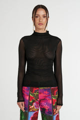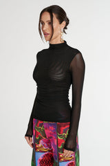 Elevate your essentials with the SUMMI SUMMI LS Ruched High Neck Top in Midnight Black. Crafted from a lightweight stretch mesh, this long sleeve top features a high neckline and elegant ruched detailing for a flattering, sculpted silhouette. The body is double-layered for added coverage, while the sleeves remain sheer for a subtle contrast.