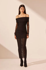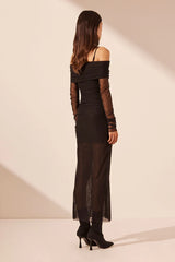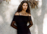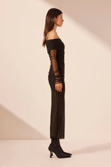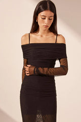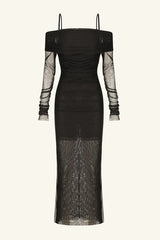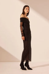 Long sleeve off shoulder midi dress in a double layered sheer mesh