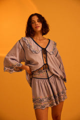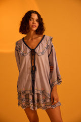 The Salvia Frill Lush Tie Front Blouse by Kinga Csilla is a versatile statement piece crafted from embroidered cotton voile. This blouse features a new tie-front silhouette, blending contemporary style with bohemian charm.