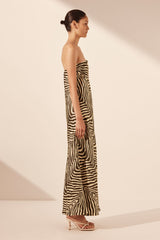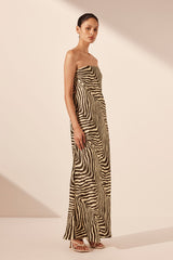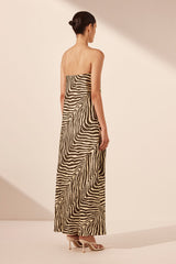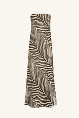 Make a bold yet elegant statement in the Shona Joy Strapless Bias Maxi Dress, featuring the striking Zebra Sana print. Crafted from luxurious 100% silk twill, this dress boasts a soft, lightweight feel that drapes beautifully over the body. With an elasticated strapless neckline for a secure fit, the dress flows effortlessly in a loose-fitting, column slip silhouette, creating a flattering shape. The bias cut enhances the fluid movement of the fabric, while the maxi length adds a touch of sophistication.