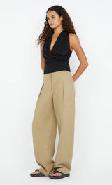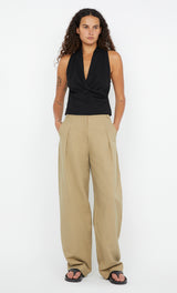 The BEC + BRIDGE Simi Wrap Top in Black is a sleek, sleeveless wrap top made from soft cotton jersey. It features a flattering V neckline with a subtle racer back and back neck band for added detail. Designed with a soft drape, this top offers a relaxed yet stylish silhouette. Accessed via pull-on styling, it's perfect to pair with BEC + BRIDGE Riya Short or Anka Pant for a chic and effortless look.