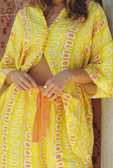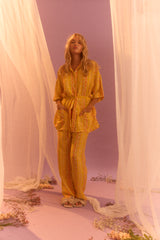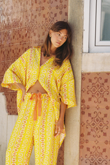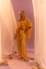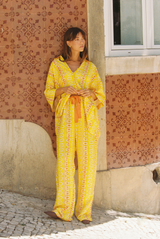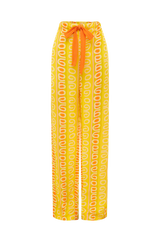 The Kinga Csilla full-length, straight-leg pant in vibrant yellow and orange, designed with a relaxed PJ-style fit and featuring a bright drawstring waist for adjustable wearability.