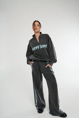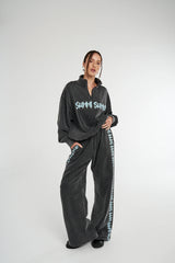 Step up your streetwear game with the SUMMI SUMMI Track Pants in Insane Summi, crafted from premium 100% cotton French terry in a vintage-washed black. These gender-neutral track pants feature a flattering bootleg silhouette, wide elastic waistband, and bold Summi Summi branded side panels—a fresh, elevated take on a loungewear essential.