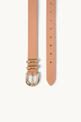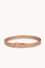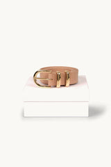 Defined by signature Dylan Kain gold-tone buckle and double metal loops, The Tia belt subtly nods to house codes of elegant and classic silhouettes. Crafted in Italian Shiny Patent Leather this classic waist or hip style is perfect for looping through your favourite pair of Jeans or layering over silk slip dresses.