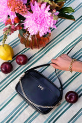 A petite version of our best-selling Rodriguez style, The Mini Rodriguez Vegan is a compact, eco friendly and elegant take on the style. Featuring dual straps for versatile styling options, the Mini Rodriguez is handcrafted with Vegea material, an innovative material made from the grape leftovers from winemaking and features Dylan Kain’s signature hardware accents.
