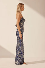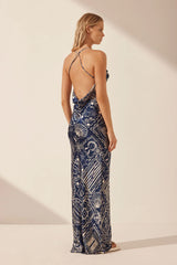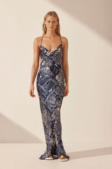 Maxi dress with cowl back and neckline in the exclusive Mer print in a luxurious silk satin.