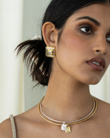 Sculptural and striking, the Archana Earrings celebrate the beauty of simplicity with a bold edge. Handcrafted in mixed metals using traditional techniques, the oversized shield-like form is finished in high polish and hammered texture, crowned with a radiant White CZ gemstone at it's center. Elevated yet effortless, they bring a quiet strength and luminous charm to the modern woman’s everyday statement.DETAILS