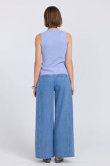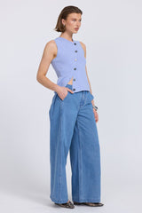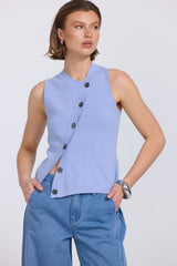 The Sovere Astrid Knit Top in Pacific is a modern take on classic knitwear, featuring a sleeveless vest-style design with an asymmetric neckline for a unique edge. Crafted from a soft viscose-blend knit, this fully fashioned piece is detailed with a wide bind at the neck and down the centre front, finished with an asymmetric button closure for an elevated, contemporary feel.