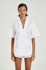 The Summi Summi Collared Short Sleeve Shirt brings effortless polish to your everyday look. Crafted from a breathable linen blend, this shirt features a boxy silhouette and embroidered “I Heart U” detailing for a playful yet refined finish. Designed for versatility, it’s perfect for pairing with tailored shorts, relaxed pants, or denim for elevated off-duty style.