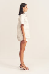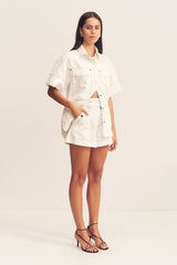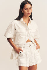 The Shona Joy High Waisted Flared Shorts in classic ivory denim. Featuring contrast stitching and a high banded waistline, these stylish shorts are designed to flatter your figure. Crafted from 100% cotton, they offer a structured, non-stretch fit that’s perfect for everyday wear. The flared silhouette adds a modern twist, while functional belt loops, a front fly closure, and side and back pockets offer both style and practicality.