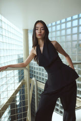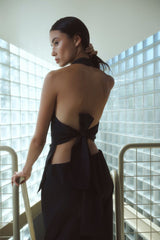 The Rae Top in Black by One of Others is a modern, open-back halter top designed with wide ties and a soft low cowl neckline. Crafted from a lightweight blend of nylon, cotton, and linen, this versatile piece can be worn tied at the back or wrapped to fasten at the front waist for multiple styling options. Effortless yet elevated, the Rae Top is perfect for night-out dressing, summer events, or pairing with tailored pants for a sleek, minimalist look.