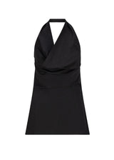 - Open-back halter design