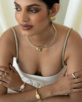 A bold expression of heritage and form, the Samira Cuff fuses architectural lines with artisanal warmth. Handcrafted by master artisans, its radiant gold finish encircles a sparkling CZ gemstone, framed in sculptural tiers that echo timeless traditions. Designed for the modern woman who moves with purpose and grace, this piece balances strength and elegance in every curve. Wear it solo as a statement or layered — a tribute to heritage, reimagined for today.