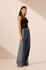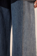 Mid rise wide leg jean in contrast indigo and pale indigo denim.