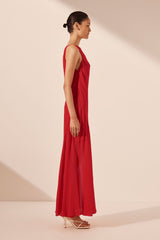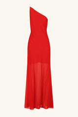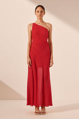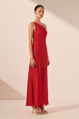 The Shona Joy One Shoulder Maxi Dress in a vibrant Chilli hue. Crafted from lightweight semi-sheer georgette, this stunning dress features a striking one-shoulder neckline and a flowing panelled skirt that adds movement and dimension. The maxi length gives an elegant, elongated silhouette, while the side seam invisible zipper ensures a seamless fit. Fully lined for added comfort, this dress is designed to make a statement while keeping you effortlessly chic.