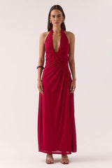 Turn heads in the Sovere Studio Alora Maxi Dress in Raspberry, a stunning halter-neck silhouette crafted from textured stretch mesh. Designed to flatter, this full-length dress features delicate gathers along the neckline and body, a soft empire waist, and an open back with an adjustable tie. The fully lined finish ensures comfort while maintaining an elegant drape, perfect for evening events, summer weddings, or date nights.