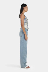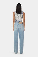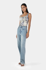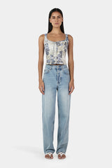 The Honey Corset Top by Ownley, designed in the unique Botanic Denim print. This structured corset-style top features flattering front princess seams and a contrast design with mesh panels across the back and shoulders. Hook-and-eye closures allow versatile styling—wear it fully fastened for a sleek fit or slightly open for a relaxed edge. Perfect to pair with tailored pants or the matching Ownley denim pieces for an effortless statement look.