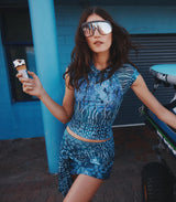 The Jolie Baby Tee in Aqua Drift brings a playful yet polished touch to your wardrobe. Crafted from lightweight stretch mesh, this fitted baby tee features delicate cap sleeves and a high neckline for a sleek, feminine silhouette. Designed for versatility, style back with denim for an elevated everyday look.