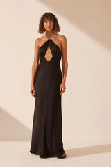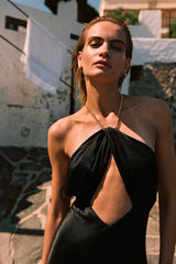 Halter chain maxi dress with low open back in a LENZING™ ECOVERO™ with luxurious satin finish.
